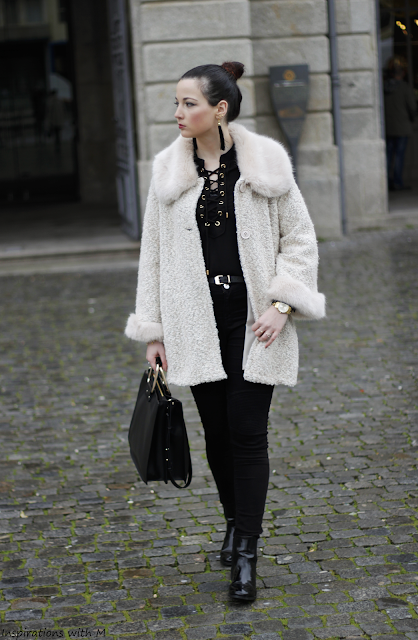 Há casacos que conjugados com peças simples chega para fazer um look...é o caso deste casaco que mostro-vos pela primeira vez aqui no blog, aquisição nova com detalhes em pelo do mais fofo que há. Conjugado com peças simples e pretas, tirando o decote claro que também dá um toque giro ao look. Os botins também são novos, dos saldos, simples e práticos...nada melhor para os dias de nhanha que tem havia com chuva.